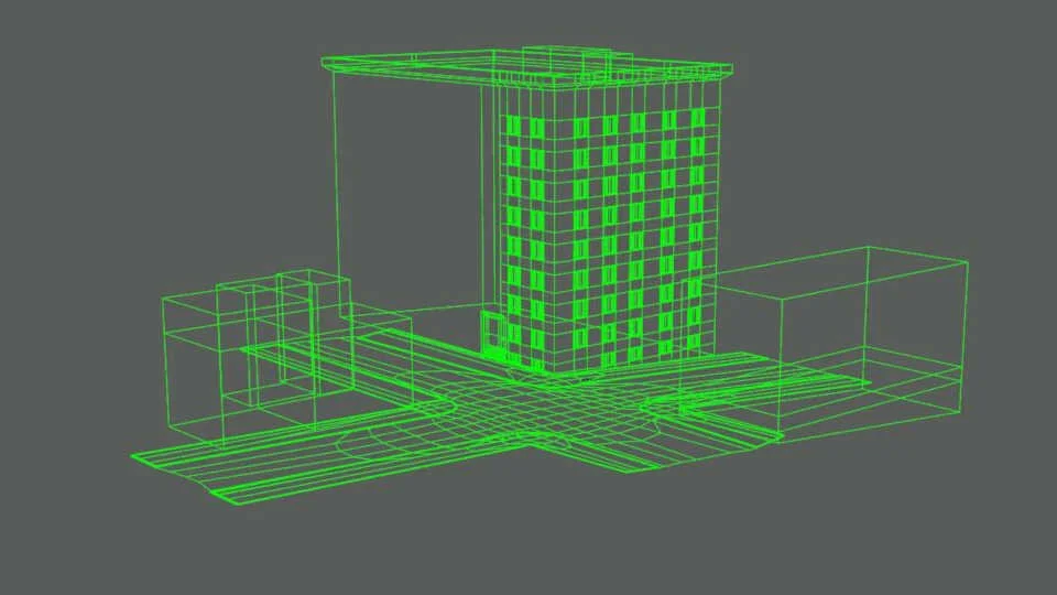 A satellite image of the street intersection with the CG location wireframe overlaid. This is where I had to make calculated decisions, so many years have passed since Bullitt was filmed so I decided to concentrate on certain landmarks.