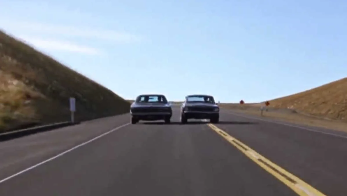 The shot from the original edit, you can clearly see that the stunt driver overshoots the turn and ploughs into the white ford. The filmmakers simply cut the car crash from the plate and held a static frame.