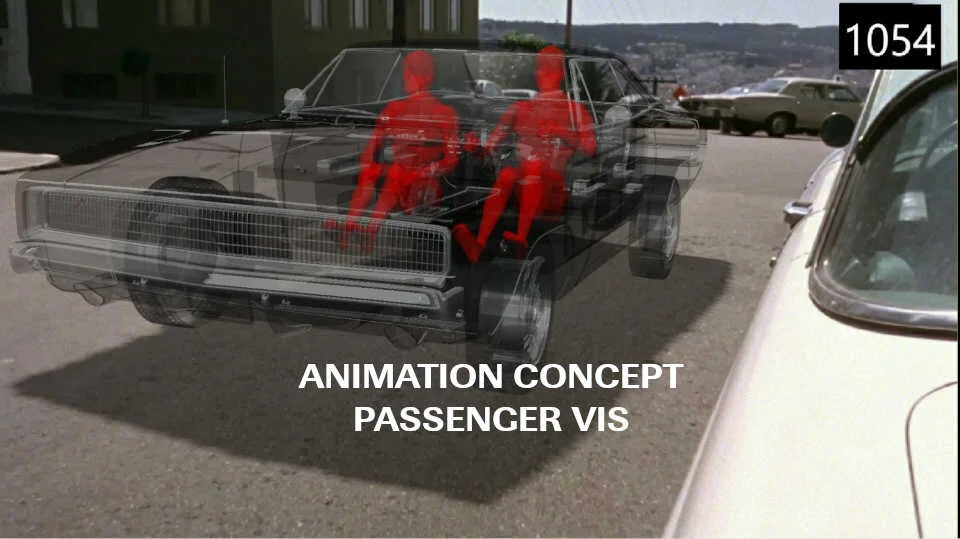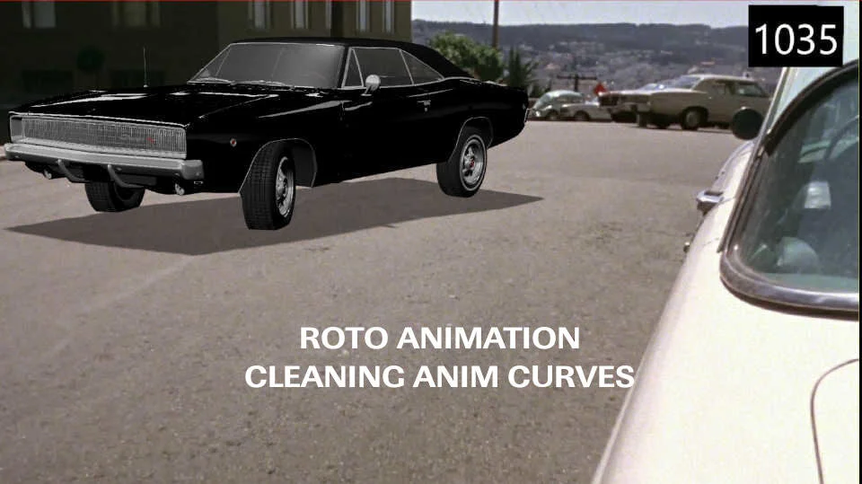 The original shot length was 63 frames, as a result, the Charger doesn’t completely leave frame. Something which could easily be addressed by extending the clean plate.