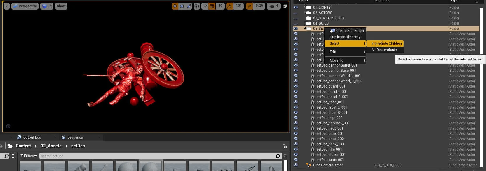 We can put all the meshes into a group and use the ‘Select Immediate Children’ option and then move the set dec around in the level. This is good but using a ‘Blueprint’ makes life a little easier.