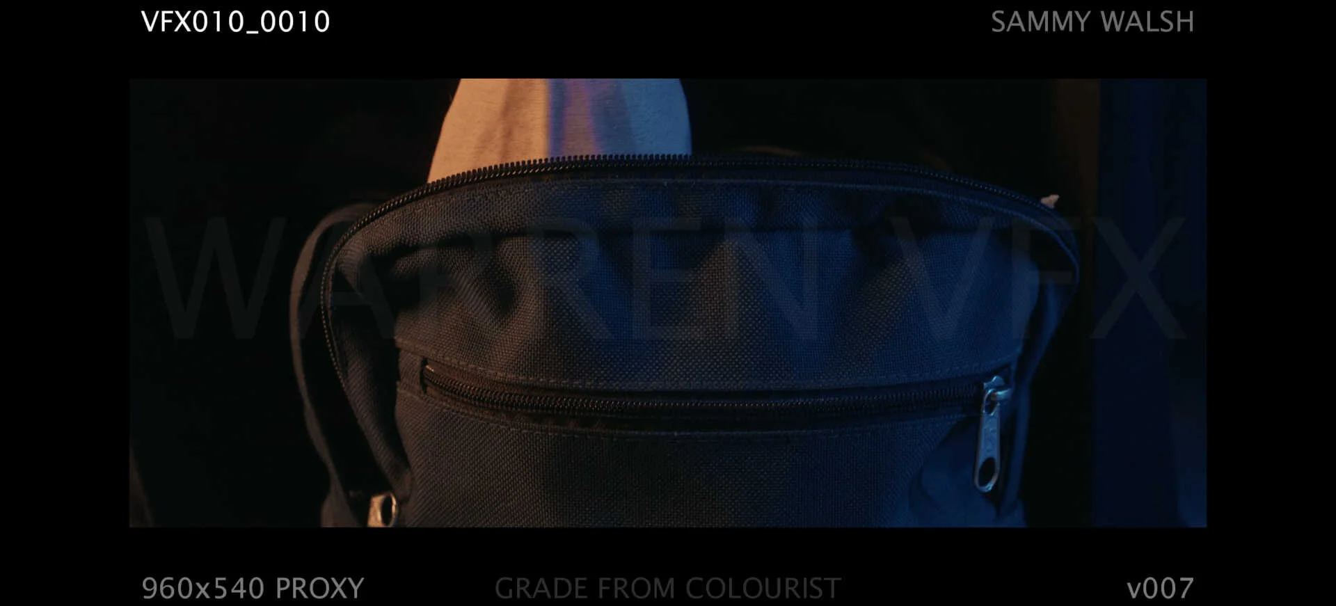 The burn-ins were also present on the shot itself. It was a homebrew pipeline but keeping each version updated proved easy. I used my default shot code and numbering for this - I want my work to be as professional as possible. The main title overlay was added as security to keep the films footage safe.
